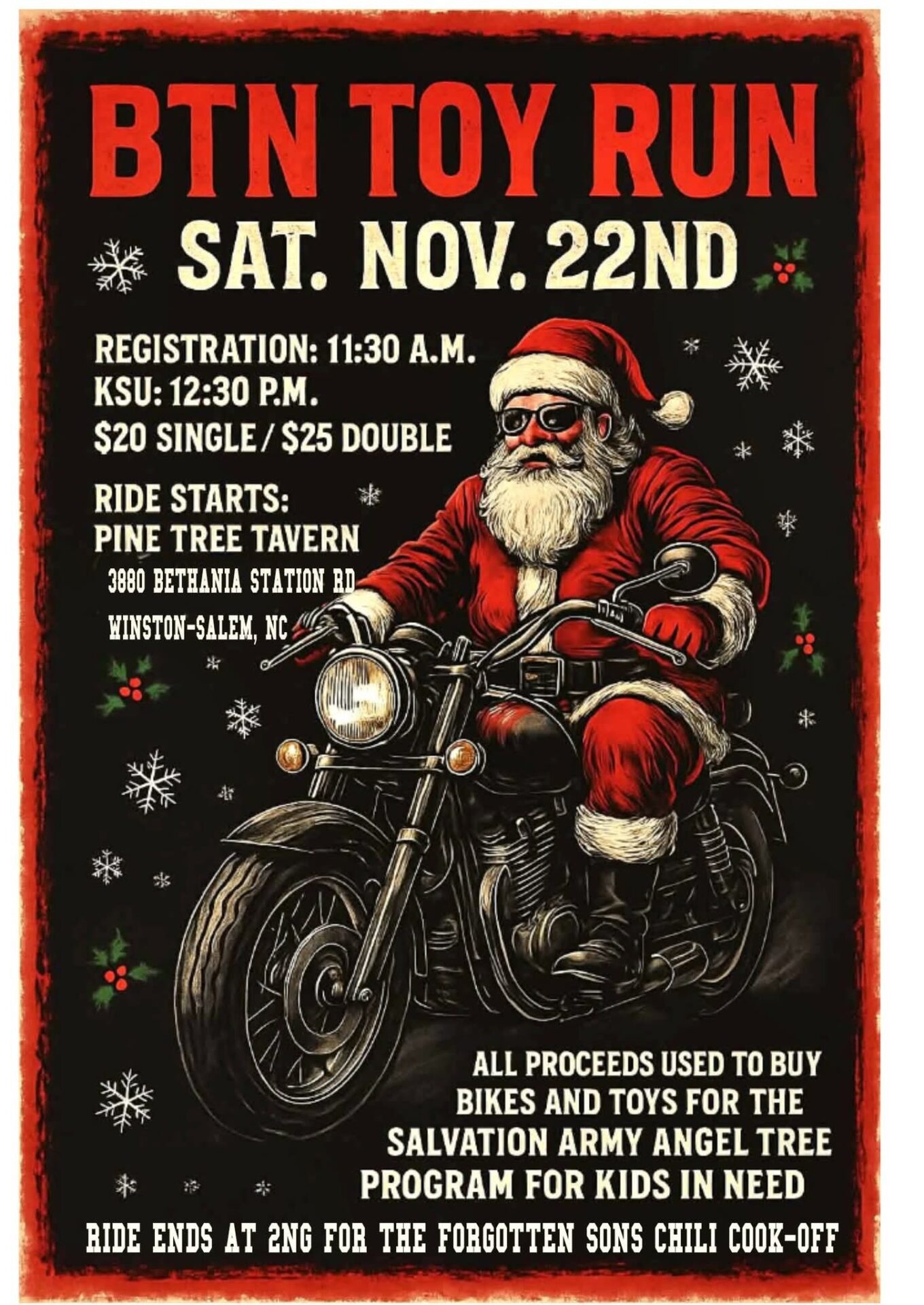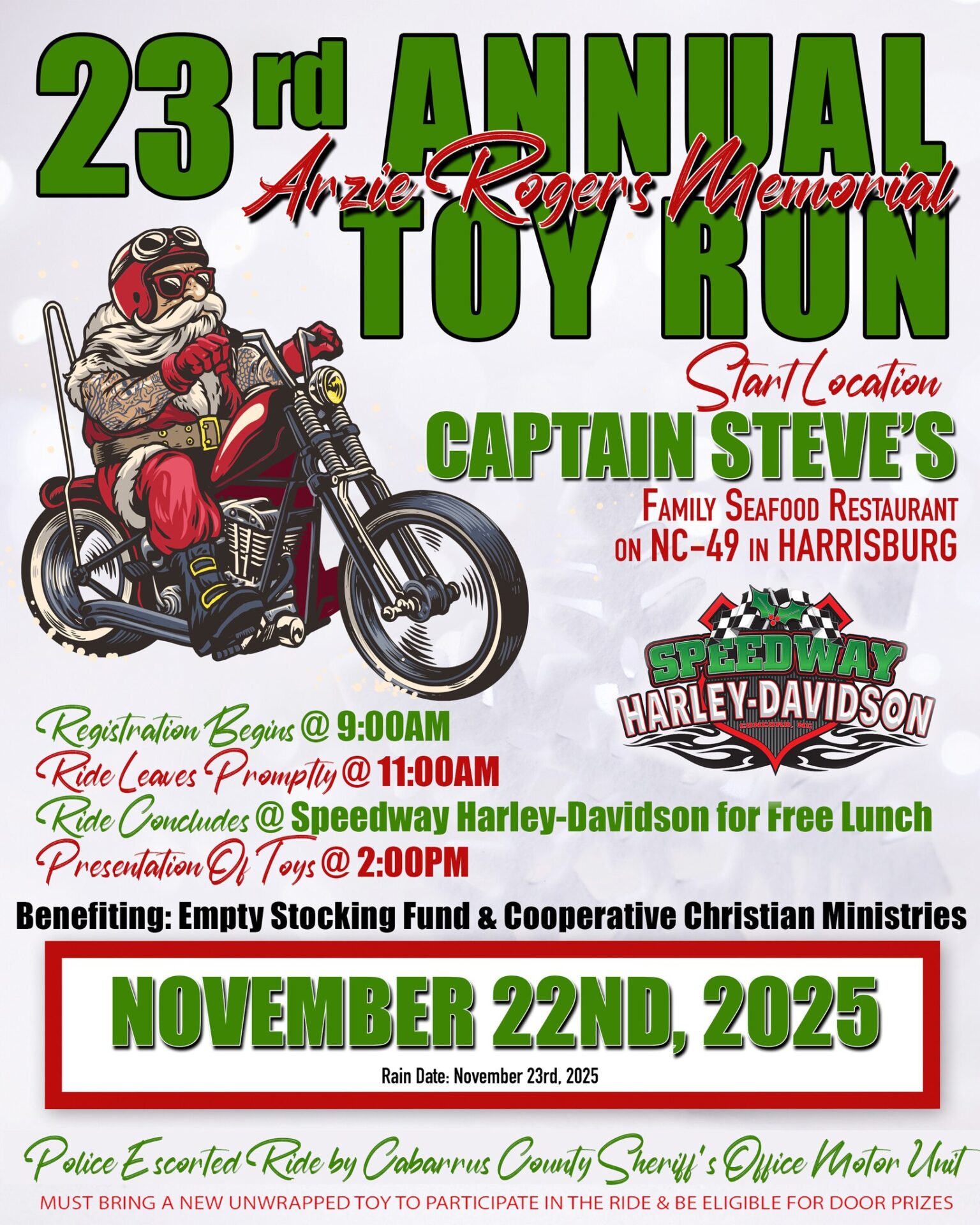 Speedway Harley-Davidson 10049 Weddington Rd Ext, Concord, NC, United States23rd Annual Arzie Rogers Memorial Toy Run Join us for a holiday tradition on Saturday, November 22nd, 2025 (Rain Date:
