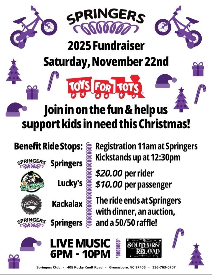 Springers 405 Rocky Knoll Rd, Greensboro, NC, United StatesCome out for a great day of riding and fundraising for Toys for Tots! Springers 2025 Fundraiser Ride for Toys