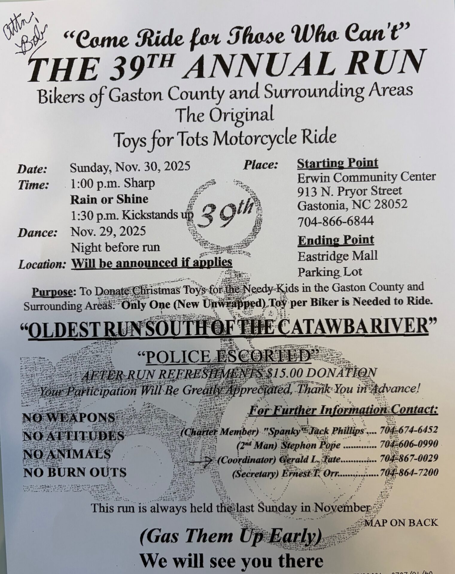 Erwin Community Center 913 N Pryor St, Gastonia, NC, United StatesThe Original Toys for Tots Motorcycle Ride