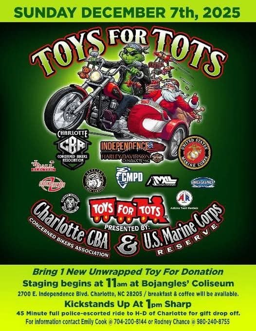 Bojangles Coliseum 2700 East Independence Blvd, Charlotte, NC, United StatesJoin us for one of Charlotte’s biggest and most meaningful holiday traditions — the Annual CBA Toys for Tots Ride,