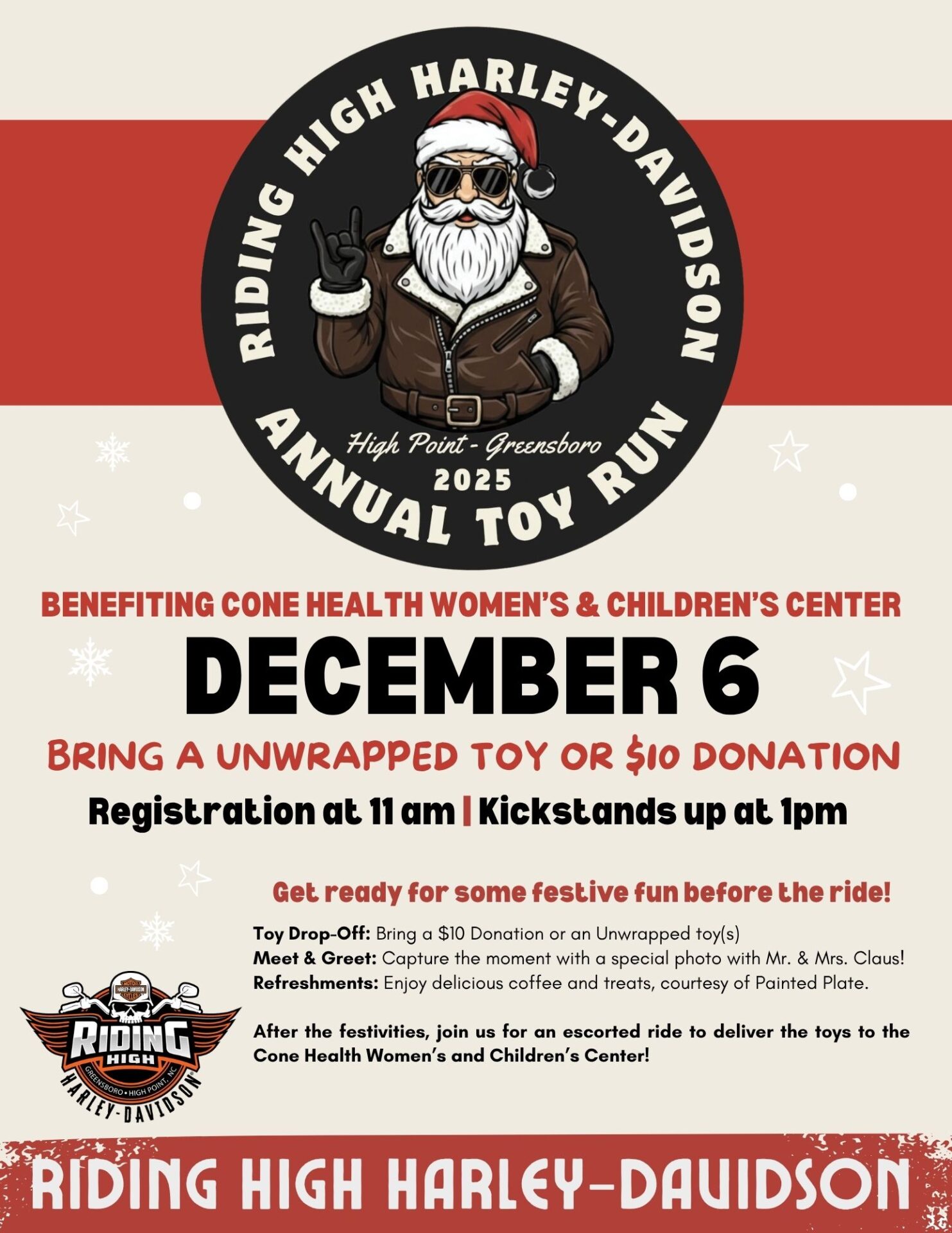 Riding High Harley-Davidson 3036 NC HWY 68, High Point, NC, United StatesJoin us as we spread holiday cheer and support the Cone Health Women's & Children's Center with our annual Toy