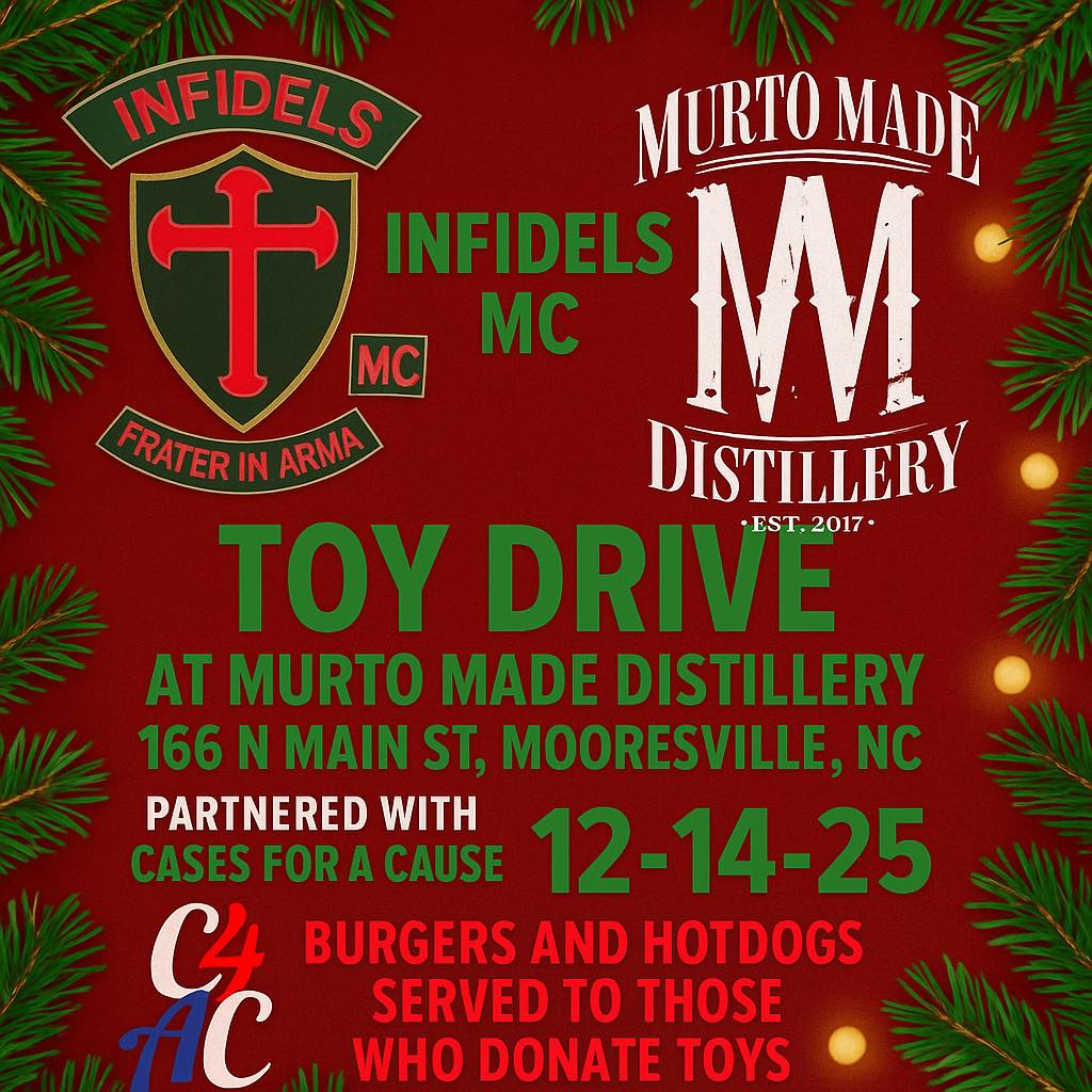 Murto Made Distillery 166 N Main St, Mooresville, NC, United StatesWe proud to team up with the all veterans Infidels Motorcycle Club for Our First Annual toy drive. All month
